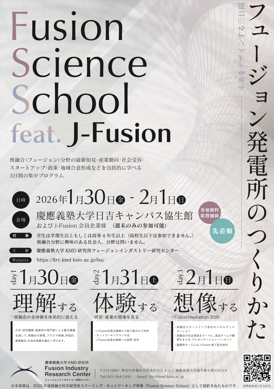 Centered around the newly established Fusion Industry Research Center, Keio University will host an intensive three-day program titled “How to Build a Fusion Power Plant: Three Days to Design the Future [feat. J-Fusion]”, to be held from Friday, January 30 to Sunday, February 1, 2026, in co-organization with the Japan Fusion Energy Council (J-Fusion).